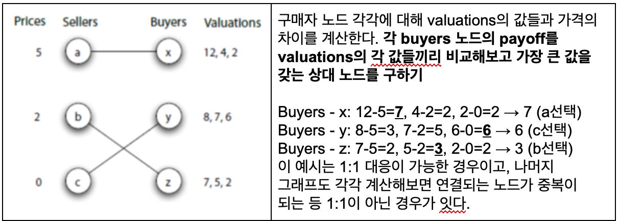 선호되는 판매자 그래프에서의 완벽한 매칭을 M이라 할 때, M의 총 payoff는 각 구매자가 자신의 payoff를 최대화하는 물건을 잡고 있으므로, M은 최대 총 payoff를 가진다. Total payoff of M = Total Valuation of M - Sum of all prices로 정의된다. → max total payoff means max total valuation