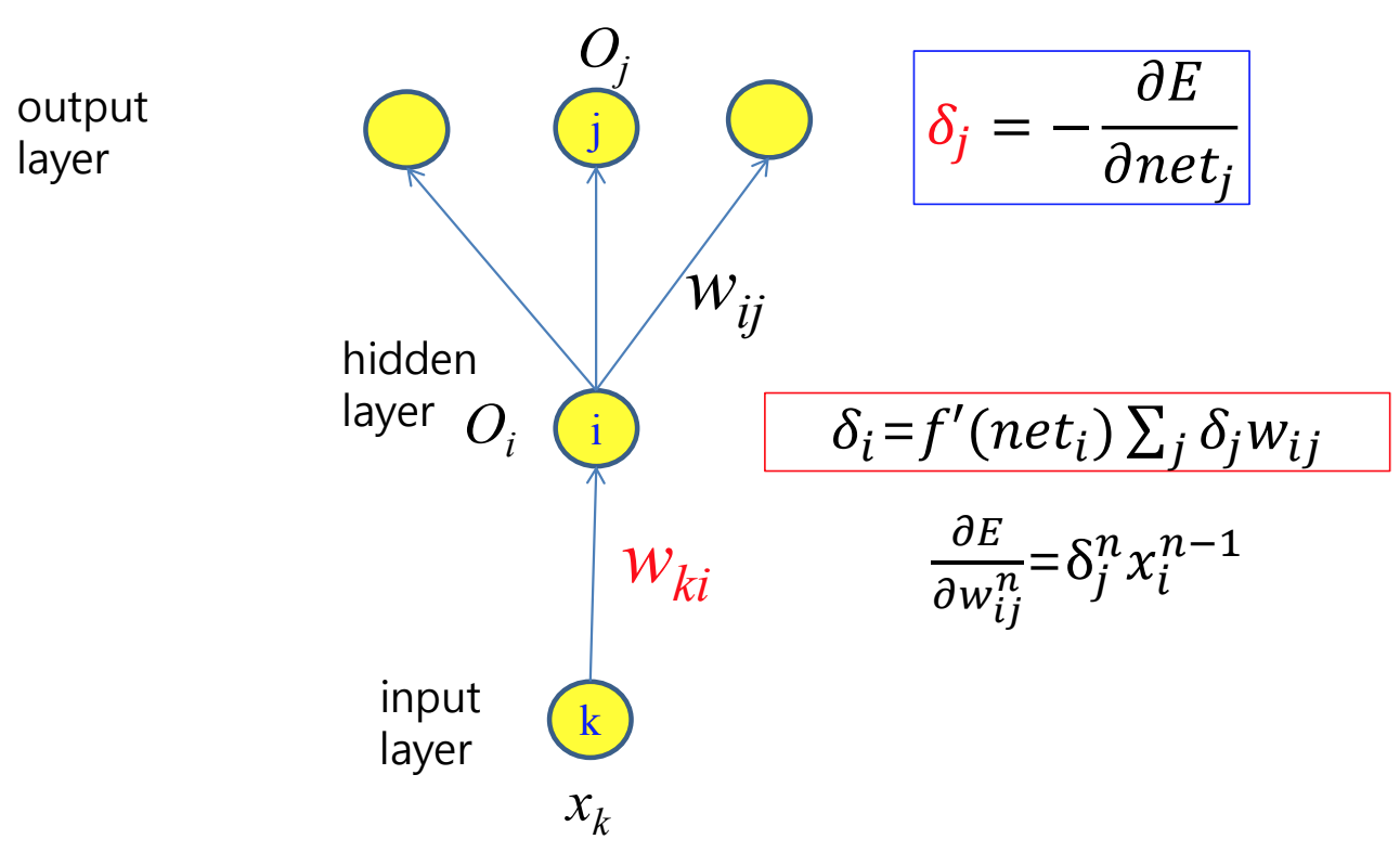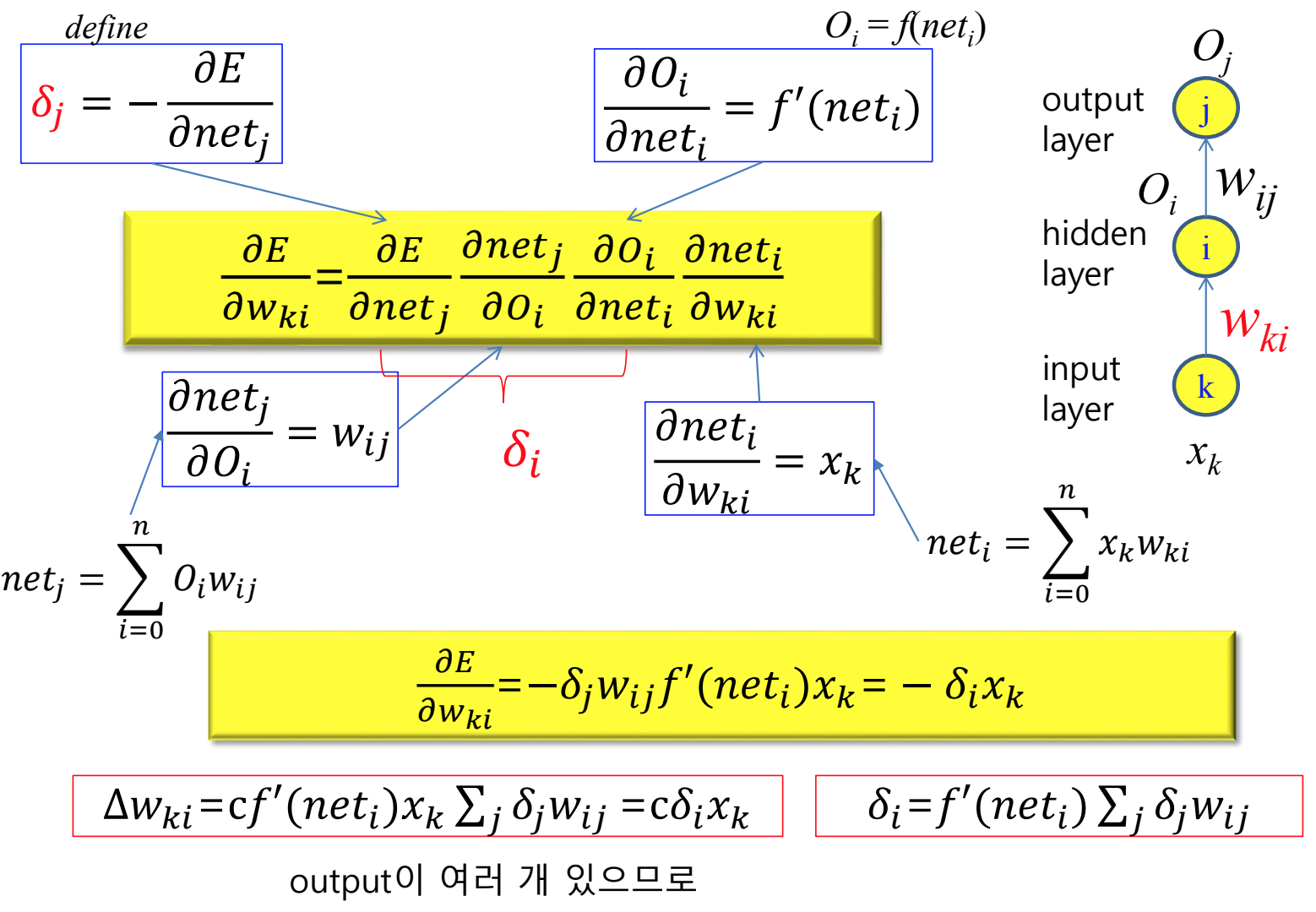 각 결과를 미분해보면 E를 W_ki에 대해 미분한 결과를 다음과 같은 수식으로 구할 수 있다.