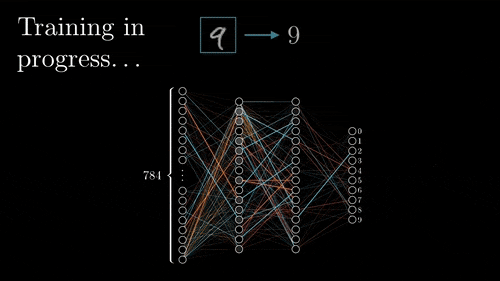 신경망을 큰 그림에서 살펴보면 연산이 수행되는 순서는 다음과 같을 것이다. 출력층에서 입력층 방향으로 간선들이 빛나는데 모두 각 노드의 미분(gradient)을 계산하여 이전 레이어와 연결된 간선의 가중치를 갱신하는 과정이다. 아래의 예시는 이미지 분류이다.