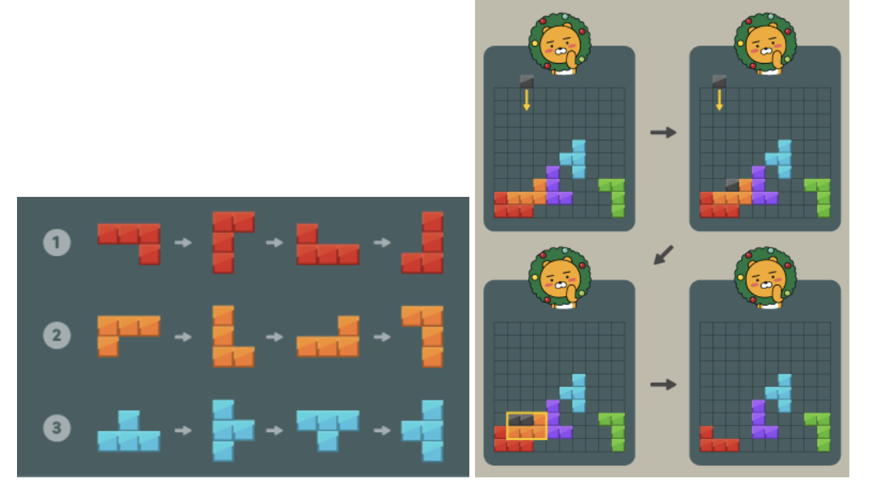 - 문제 설명: 왼쪽 그림에 소개된 블록들만 배치된 2차원 배열 보드가 주어질 때 오른쪽 그림과 같이 검은 블록을 떨어뜨려 속이 꽉 찬 직사각형을 만들어 없앨 수 있다. 이 때 제거 가능한 블록의 최대 개수를 반환하는 함수를 작성하라.
