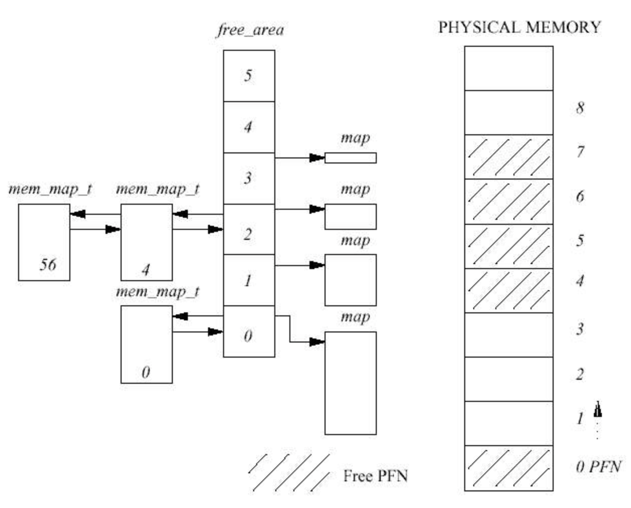 - frea_area 자료구조는 할당되지 않은 물리 페이지들을 저장하는 배열이며, i번째 원소는 2^i 개의 연속적인 페이지들을 갖는 연결 리스트의 포인터