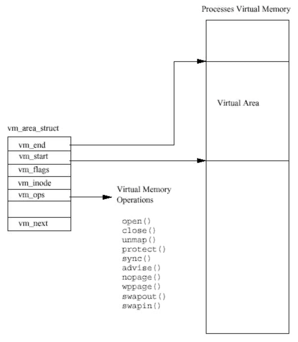 - 각 vm_area_struct 구조체는 가상 페이지의 시작(vm_start)과 끝(vm_end), 메모리에 대한 연산(vm_ops), 접근 권한 등의 정보를 나타내며, 실행 이미지의 일부를 기술함