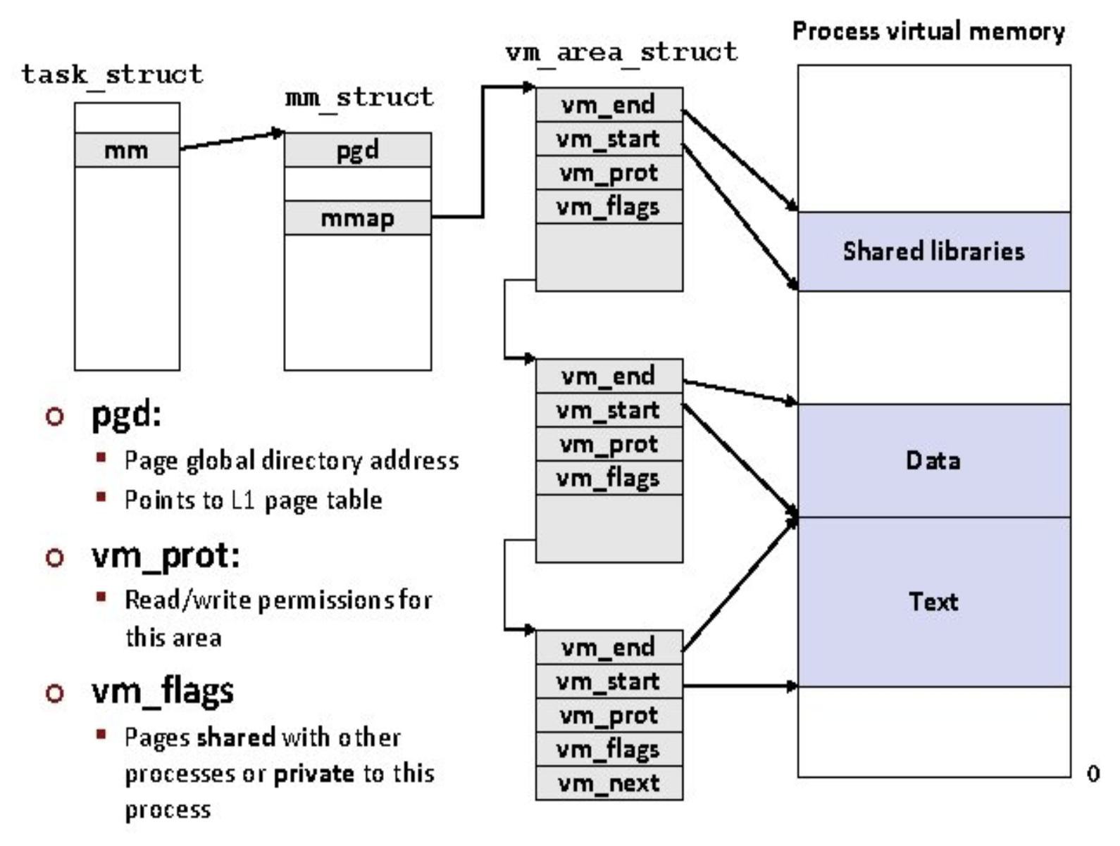 - 모든 프로세스의 가상 주소공간은 mm_struct 자료구조로 관리되며, 이 자료구조는 실행중인 이미지에 대한 정보 및 가상 페이지를 기술하는 vm_area_struct 구조체의 리스트의 포인터(=mmap)를 가지고 있음
