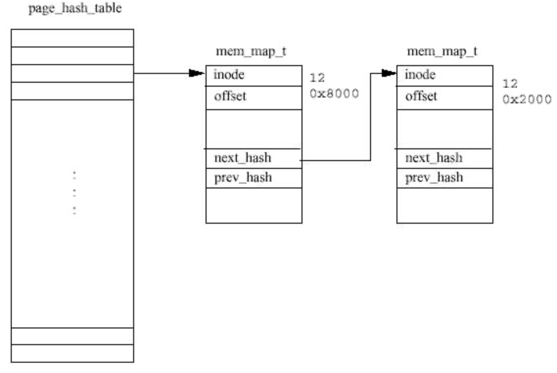 - 페이지 캐시는 page_hash_table 자료구조로 나타내며, 각 원소는 mem_map_t 구조체의 리스트의 포인터
