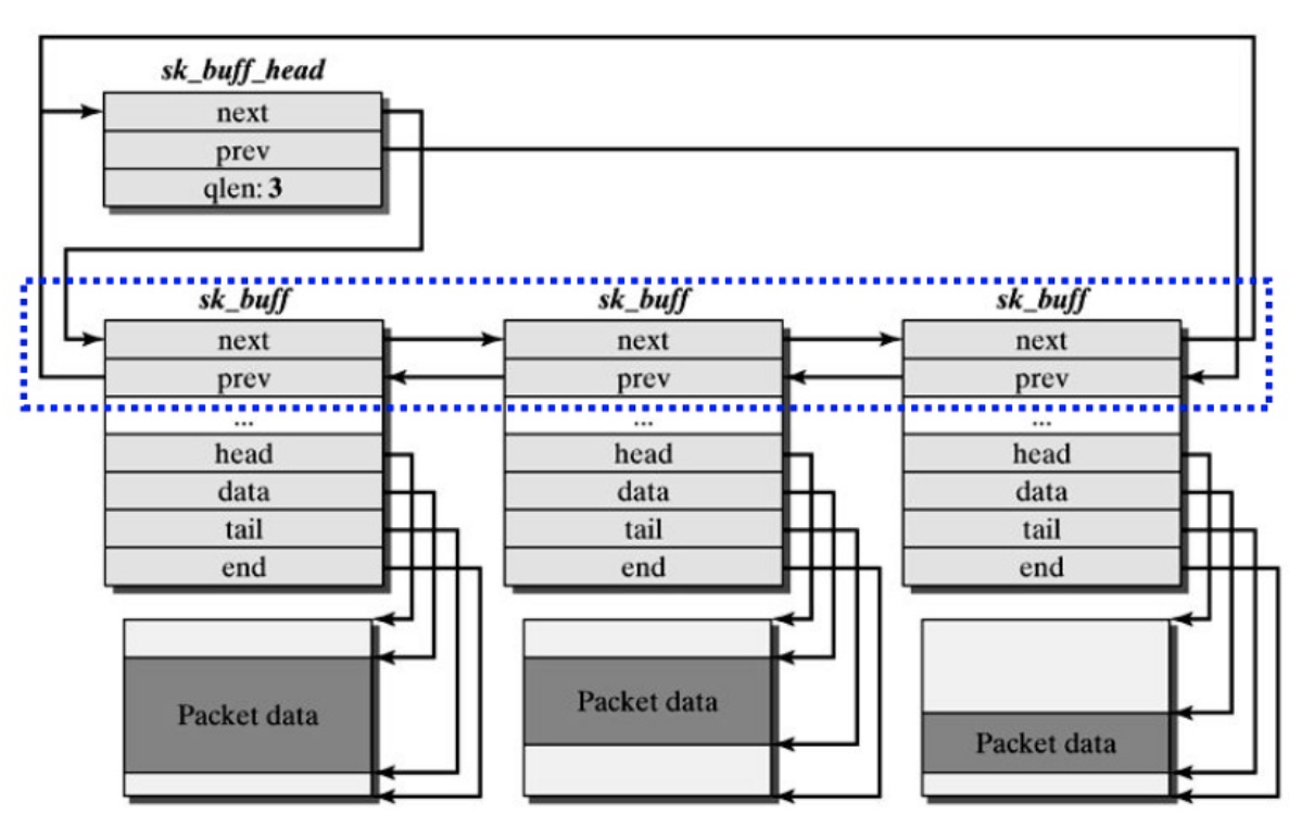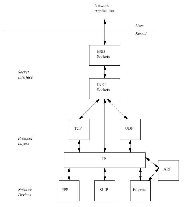 TCP/IP 프로토콜을 포함하는 인터넷 주소 패밀리를 지원, 한 프로토콜이 다른 프로토콜의 서비스를 이용하며, 리눅스 TCP/IP 코드와 자료구조는 프로토콜들의 계층 구조를 반영