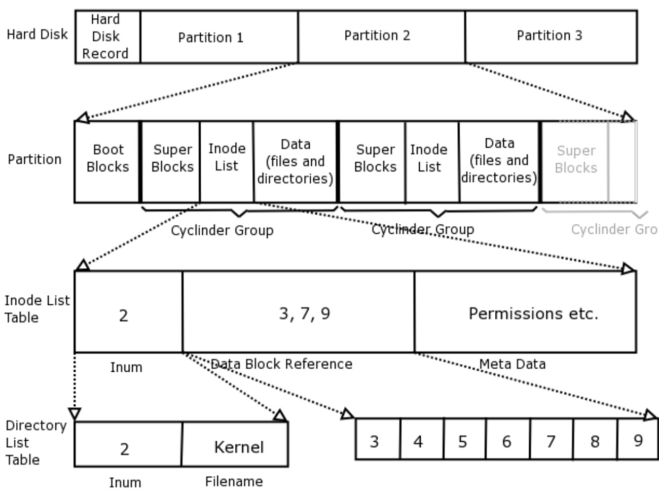 루트 디렉토리의 inode 번호는 파일 시스템의 수퍼블럭에서 얻으며, 이 번호의 파일을 읽기 위해 해당 블럭 그룹의 inode 테이블을 이 번호로 인덱싱하여 엔트리를 얻음