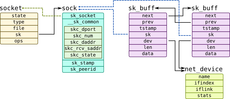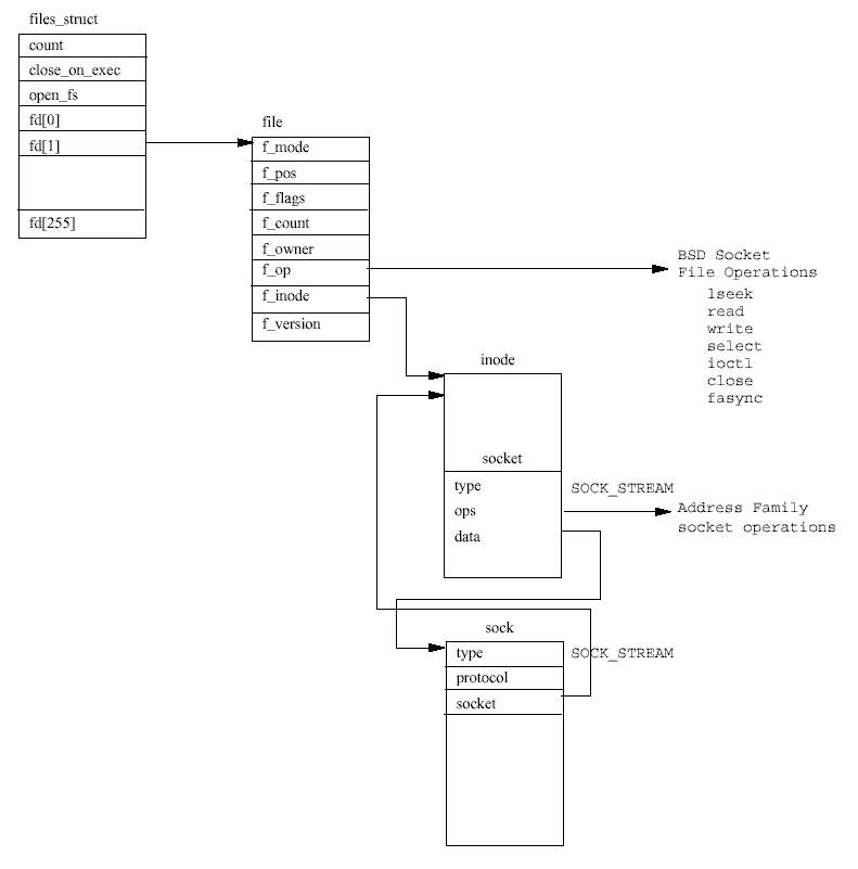 BSD 소켓 계층은 각 함수를 호출할 때마다 INET 계층에 있는 BSD 소켓을 나타내는 socket 구조체를 전달하고, socket 구조체에 있는 data 포인터는 sock 구조체를 참조하는데, 이 구조체는 INET 소켓 계층에서 사용됨
