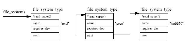 각 파일 시스템들은 부팅 중 초기화될 때, 자신을 VFS에 등록하여 커널에 파일 시스템이 포함될 수 있으며, 특정 파일 시스템을 마운트하는 경우 모듈에 의해 VFS에 등록됨