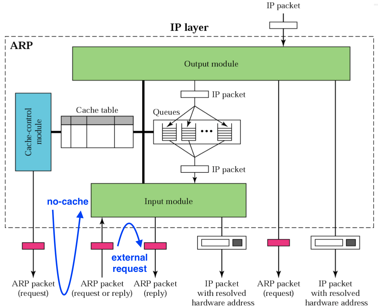 이더넷 같은 다중 접속 프로토콜을 통해 IP 패킷을 보내려면, IP 계층은 IP 호스트의 이더넷 주소를 탐색 (IP 주소는 개념적 주소이며, 이더넷 장치는 고유한 물리적 주소를 가짐)