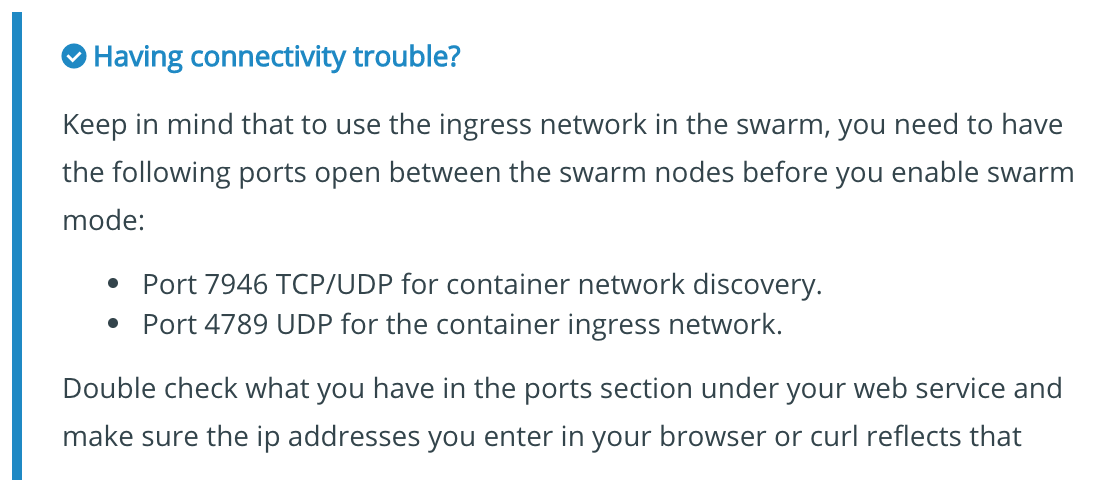 또한 overlay 네트워크 사용 시 도커 문서내에서는 7946과 4789 포트 개방을 필수로 하라고 되어 있음