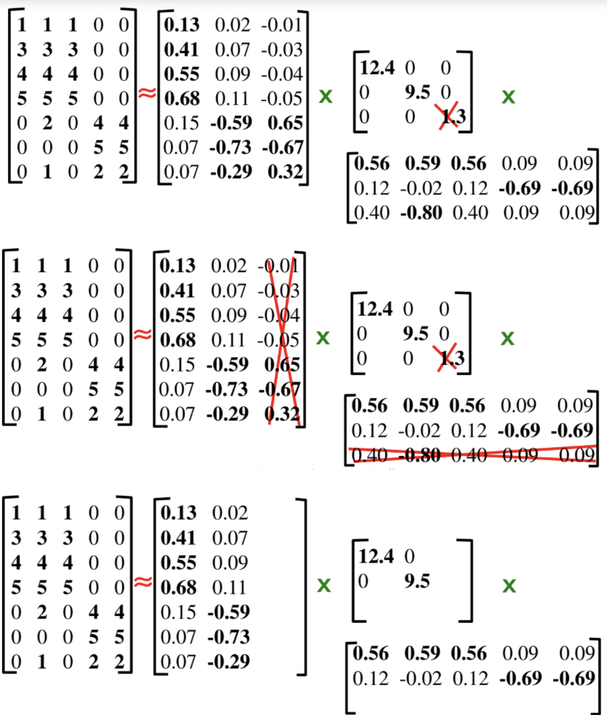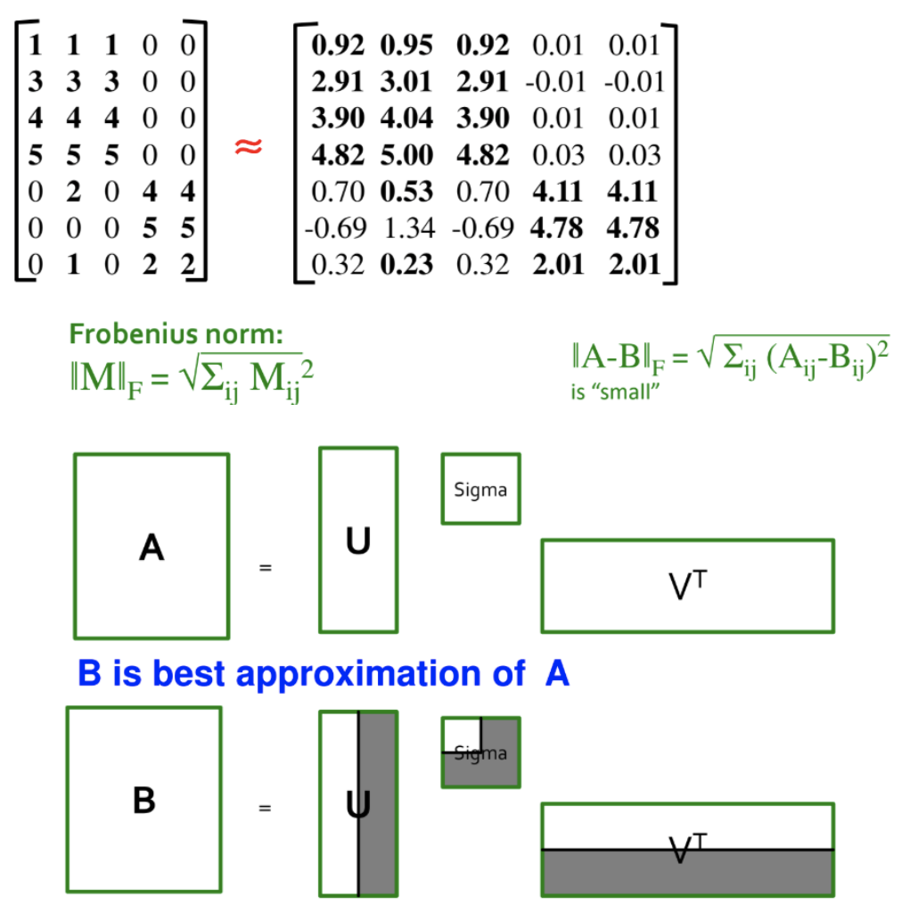 결국, 가장 작은 특이값을 0으로 만든다는 것은 원본 행렬 A에 가장 근사하면서도 불필요한 특징(noisy feature)을 제거한 행렬 B를 얻을 수 있다는 의미이며 동시에 두 개의 직교 행렬의 벡터들을 사용하지 않으니 차원을 축소했다고도 볼 수 있다.