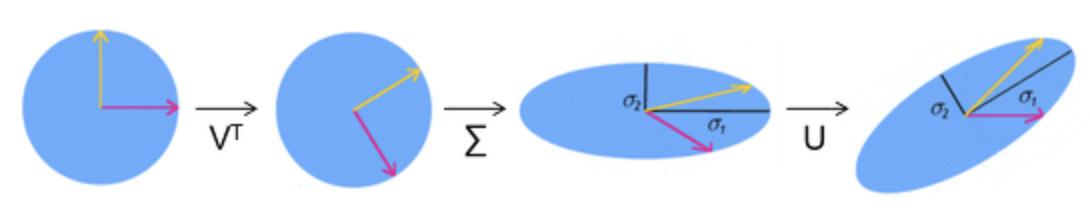 정리하자면, 벡터 x를 행렬 A로 변환했을 때, Ax는 x를 먼저 V^T에 의해 회전시킨 후 Σ로 스케일을 변화시키고 다시 U로 회전시키는 것임을 알 수 있다.