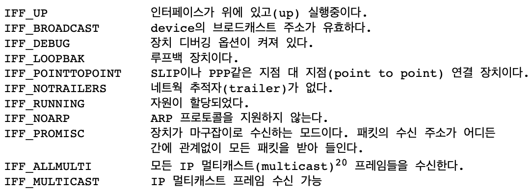 - IP 계층 아래의 PPP 또는 이더넷 같은 네트워크 장치들이 리눅스의 모든 네트워킹을 지원하며, 네트워크 장치는 항상 물리 장치를 가리키는 것이 아니라 루프백 장치 같은 몇몇 순수 소프트웨어로 작성된 것도 존재