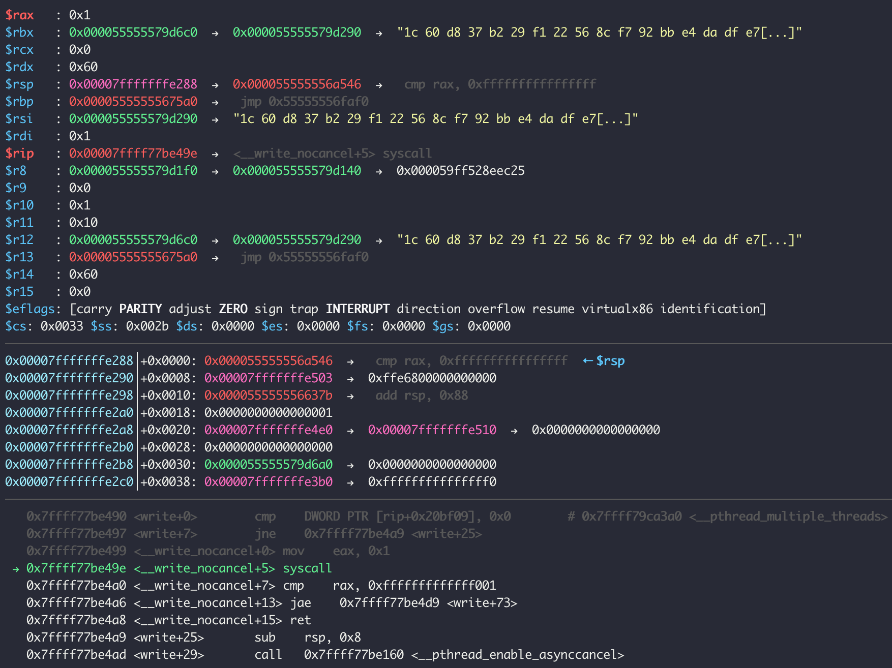 눈여겨 보고 있던 0x55555579d230 위치에 헥사값이 들어갔다. 즉, 0x55555555dc90 에서 알고리즘을 수행한다는 것을 알 수 있다.