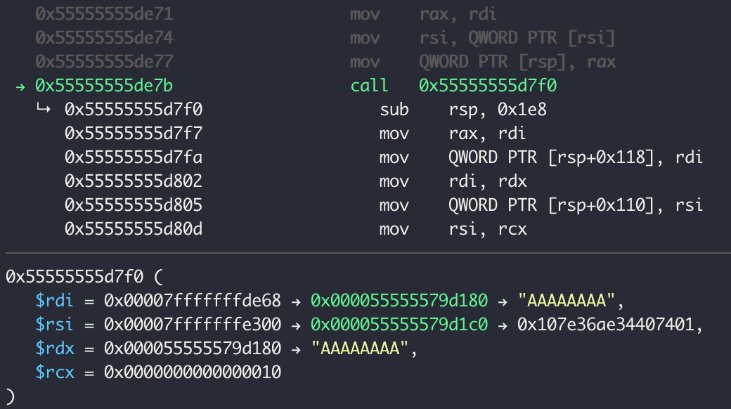 최종적으로 함수 0x55555555d7f0 을 호출해서 입력값을 1바이트씩 변경하는데 호출당시 인자를 살펴보면 입력값 외 다른 값이 별도로 들어간다. (입력값의 메모리 위치가 처음(0x~150 --> 0x~180)과 다른 것은 중간에 입력값을 복사해서 생긴 것이다. - 별로 중요하진 않음..)