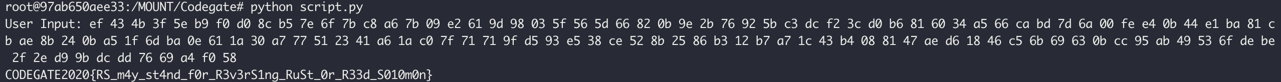 문제는 Rust 바이너리를 리버싱해서 플래그를 찾으라는 거다. 2개의 파일 rs, result 이 주어지고 각 파일의 실행결과는 다음과 같다.