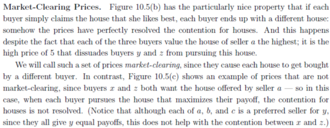 가격과 payoffs: 각 판매자 i가 집을 가격 Pi로 판매한다고 할 때, 만약 구매자 j가 해당 가격에 집을 구매한다면 구매자의 payoff는 그 집에 대한 valuation에서 지불해야 했던 금액을 뺀 것으로 정의된다. (Vij - Pi) 가격 집합이 주어졌을 때, 구매자 j가 payoff를 최대화하길 원한다면, 판매자 i로부터 이 품질 Vij - Pi를 최대화하도록 구매할 것이다.