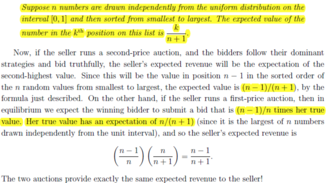 first-price auction에서 입찰자들은 second-price auction에서 입찰하는 것보다 더 낮은 입찰가격을 제시 하는 경향이 있을 것이고, 사실 이 입찰의 인하는 마지막 낙찰자의 가격 크기 차이로 보일 수 있으므로, 위의 경향이 아닌 경우에 차이가 발생하는 걸 없앤다.