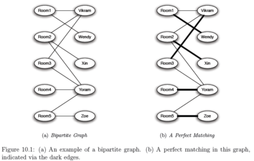 우리는 완벽한 매칭으로 이러한 과제를 언급한다. 이분 그래프의 양쪽의 노드들의 개수를 동일하게 할 때, 완벽한 매칭은 왼쪽과 오른쪽에서의 노드들을 할당하는 것이다.