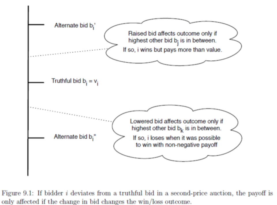 증명: 만약 입찰자 i가 bi = vi 로 낙찰할 때, 다른 이들이 사용하는 전략에 무관하게 가격을 바꾸는 어떤 행동도 payoff를 향상시키진 않는다는 사실을 보여야 한다. 입찰자 i가 입찰가를 올리는 상황과 입찰가를 내리는 상황 2가지 경우를 고려해보자. 핵심은 두 경우 모두 입찰가격만 입찰자 i가 이길지 말지에 영향을 주지만, 실제 낙찰하는 상황에서 얼마나 많이 지불할 지에는 영향을 주지 않는다. 지불하는 양이 다른 입찰 가격에 의해 전적으로 결정되고, 다른 가격들 중 가장 큰 가격에 의해 특히 그러하다. 입찰자 i가 가격을 수정할 때 모든 다른 입찰가격이 그대로이기 때문에, i의 입찰가격 변화는 오로지 입찰자가 이기는/지는 결과가 바뀐다면 실제 Payoff에 영향을 준다.