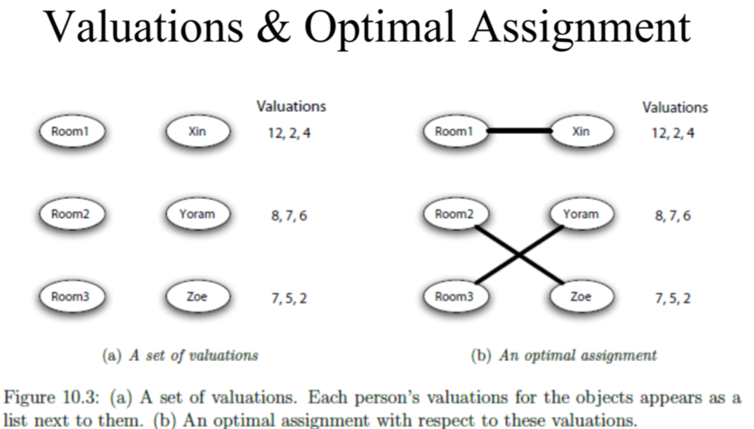 그림 (b)에 대한 설명: Valuations 에서 가장 큰 값을 갖는 경우의 Room 으로 매칭이 이루어진다. 근데 7,6 처럼 차이가 크지 않은 경우(두번째 집합)는 다음 값을 보고 행동을 결정한다. 5,2의 차이는 7,6보다 차이가 크기 때문에 Room 2 와 Room3 의 엣지를 크로스 매칭한다.