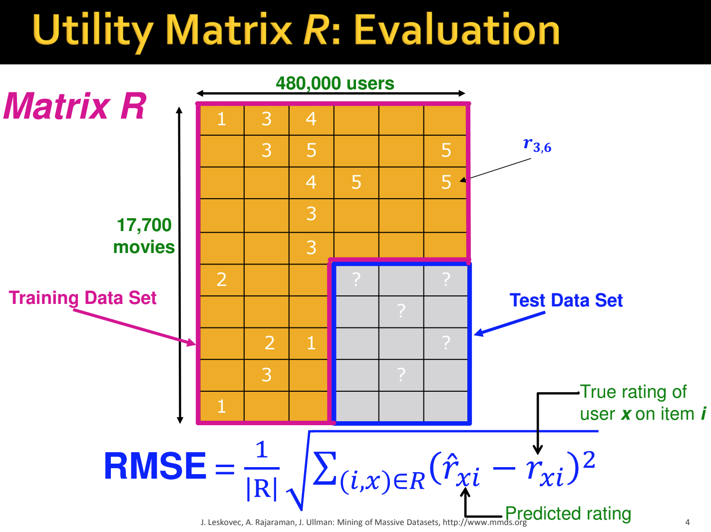 - 알려진 등급(user, item)에 대해 잘 작동하도록 시스템을 구축하는 것 → 모르는 등급을 잘 예측할 수 있다.