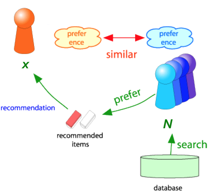 - 집단 N 에서 사용자들의 등급 부여 방식을 기반으로, 고객 x가 매긴 등급을 측정(유추)