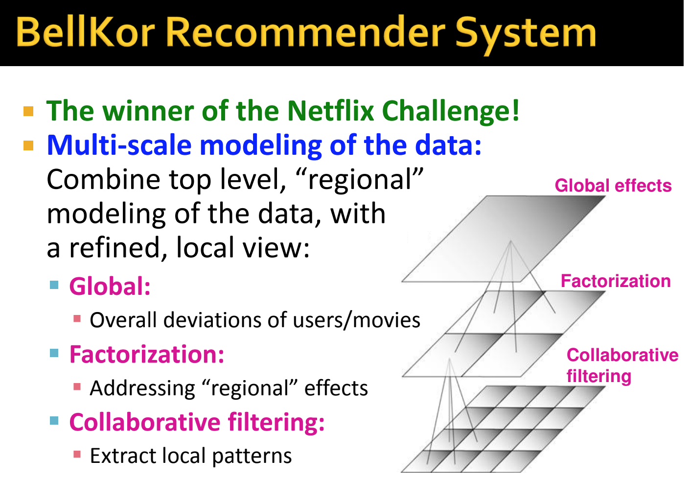 - 전역 효과 예시: 평균 영화 등급이 3.7이고, 식스센스의 평점이 평균 보다 0.5 점 높을 때, Joe는 평균 보다 0.2점을 더 낮게 평가한다면, 식스센스는 4점(=3.7+0.5-0.2)일 것이다.