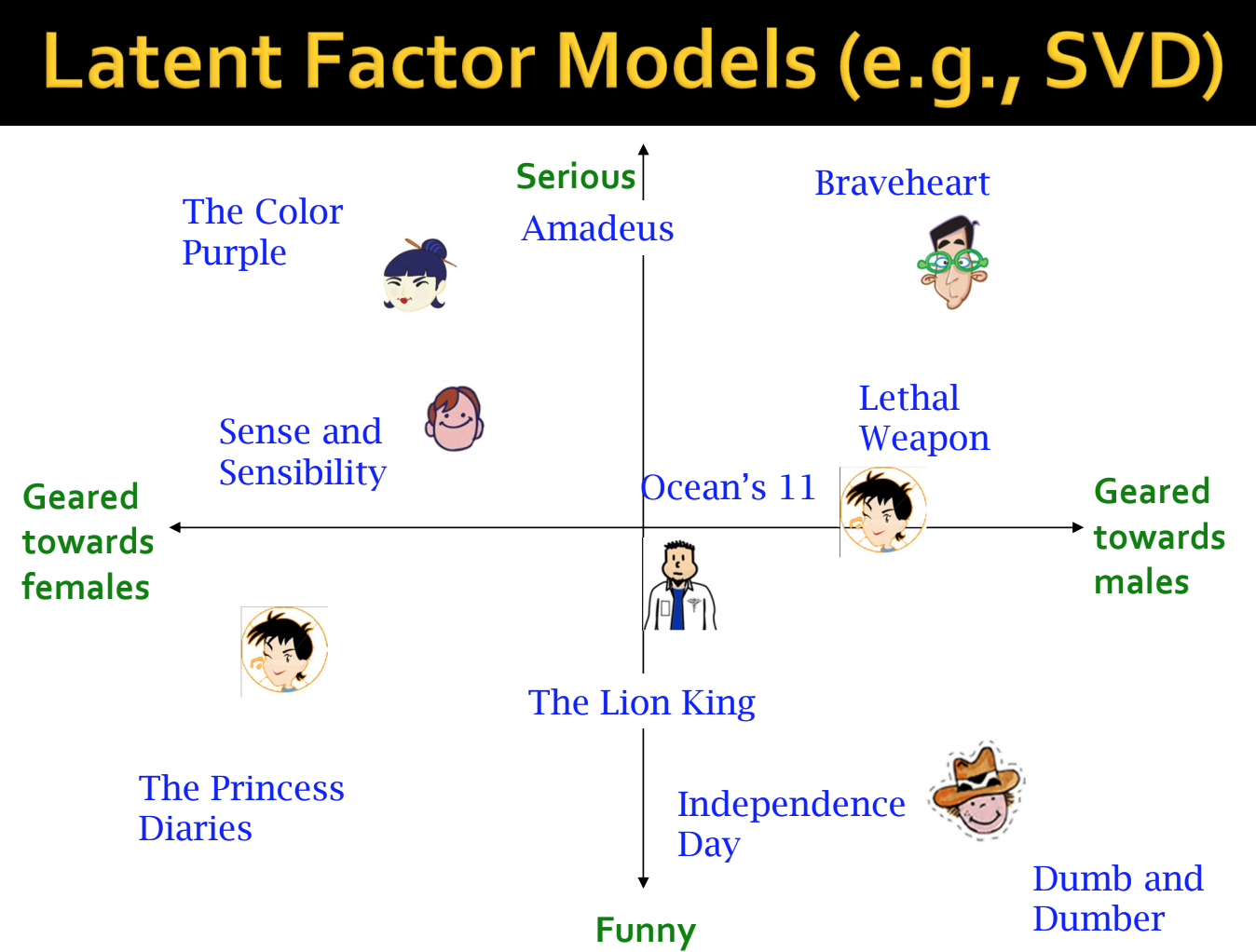 - Latent factor based: 확실하지 않으나 존재하는 기준이나 카테고리 또는 요소를 이용(잠재 변수 기반)
