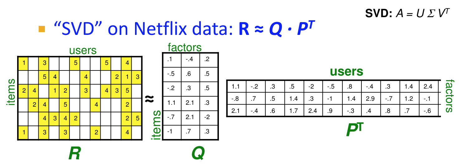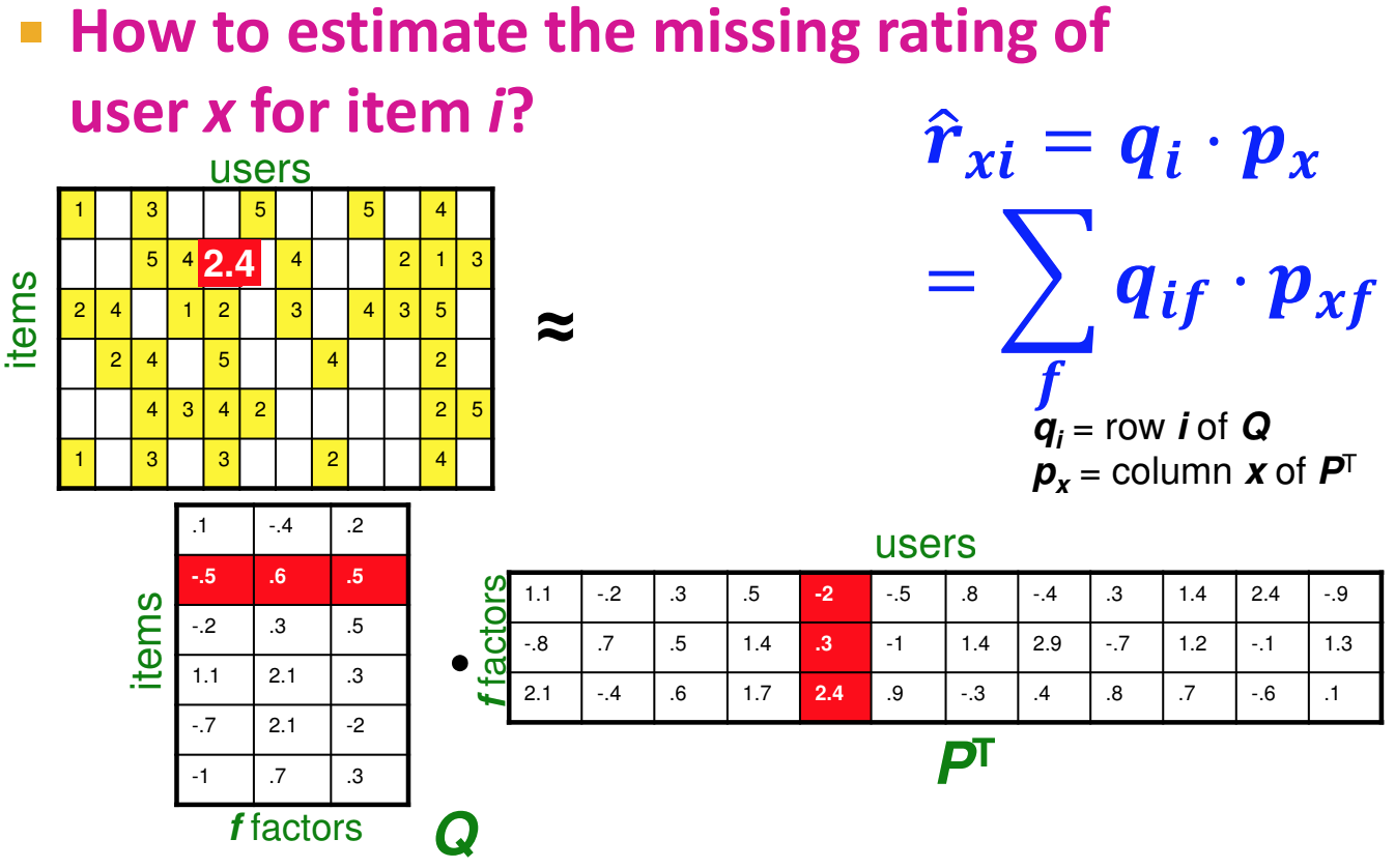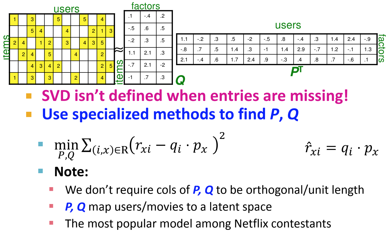 엔트리가 없을 때는 SVD는 정의되지 않는다. 행렬 P, Q를 찾기 위한 구체적인 방법을 사용해야 한다.