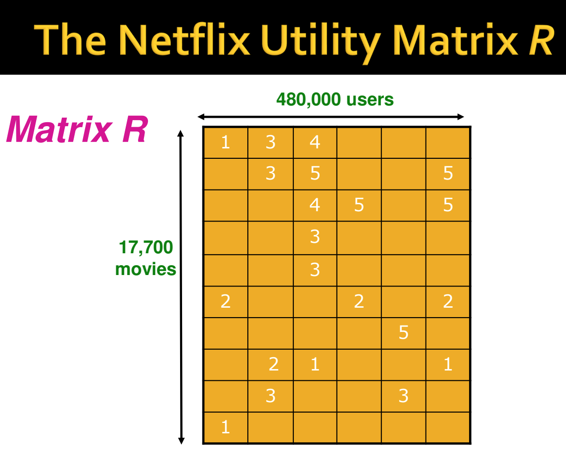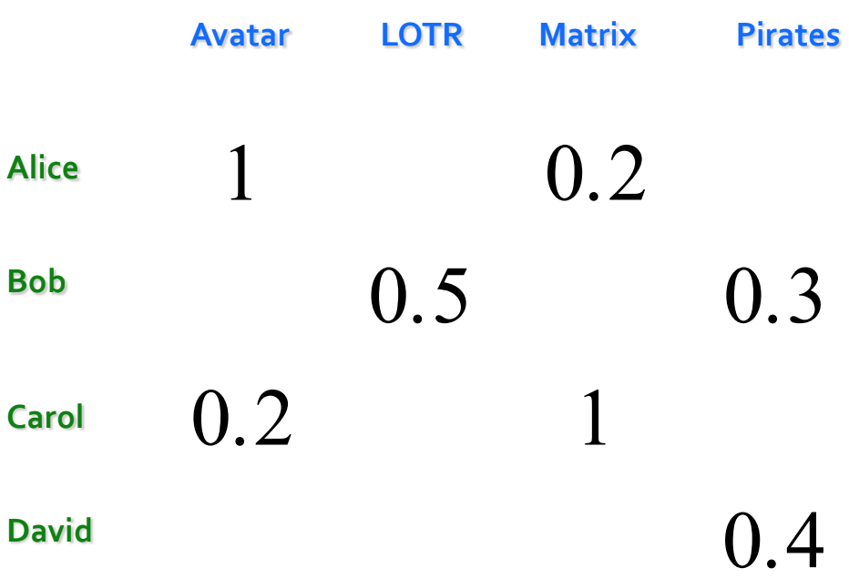 - Utility Matrix U is Sparse → 대부분 사람들은 많은 아이템에 평점을 남기지 않는다.