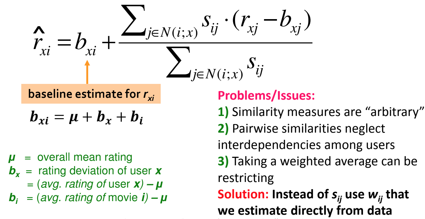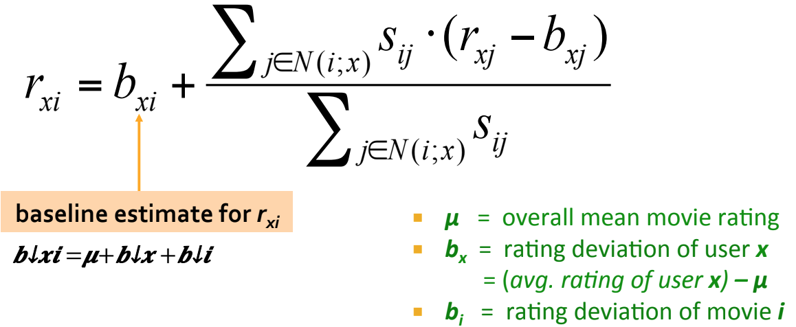 - N(i; x) = 고객 x에 의해 등급이 매겨진 아이템 i와 가장 유사한 아이템들