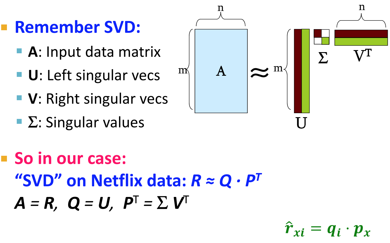 (그냥 SVD는 동작X) → 엔트리가 있는 값들(not missing data)만 가지고 오류의 최솟값을 찾는다.