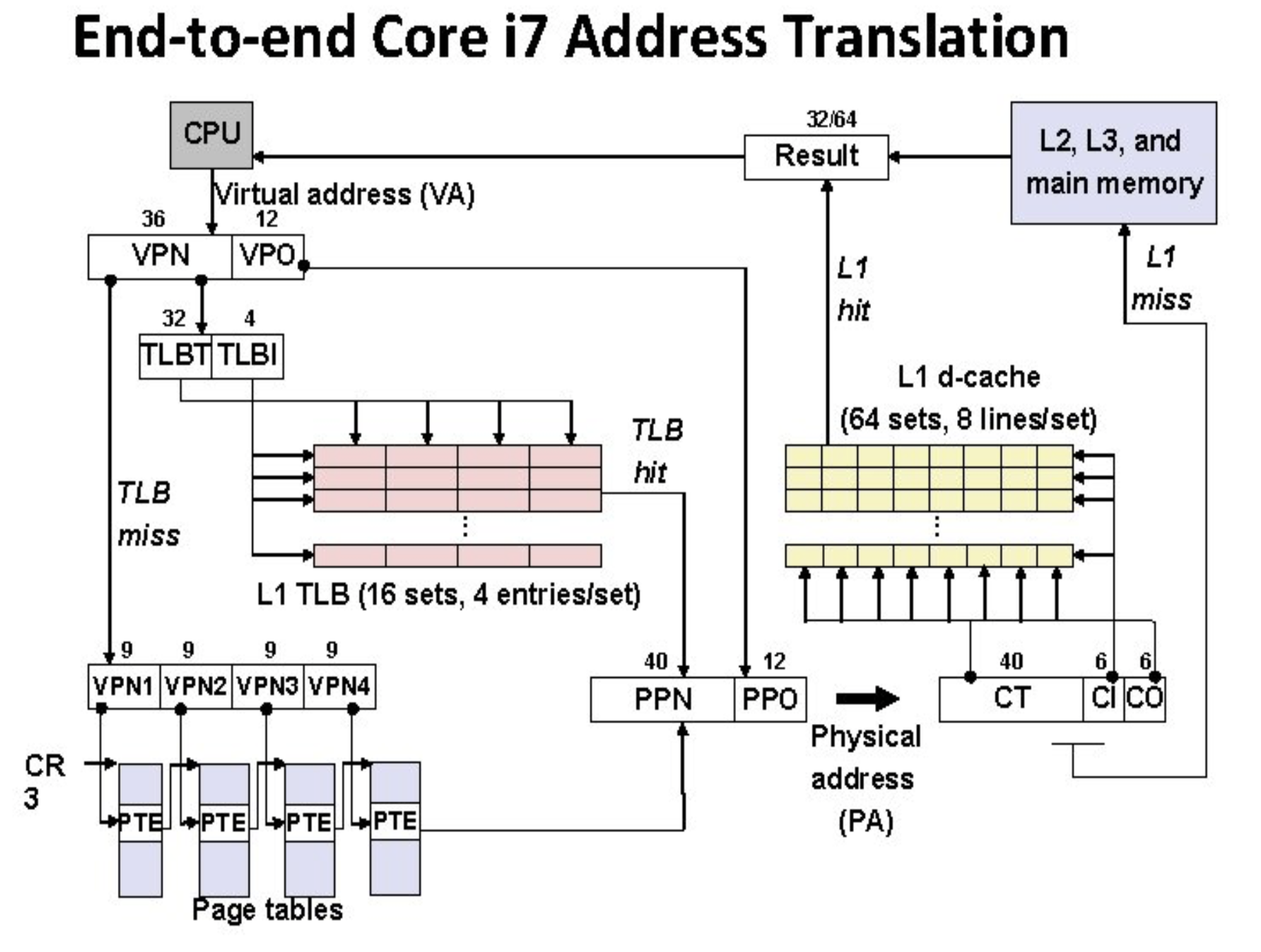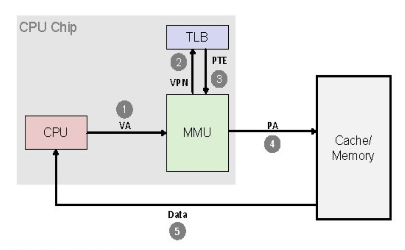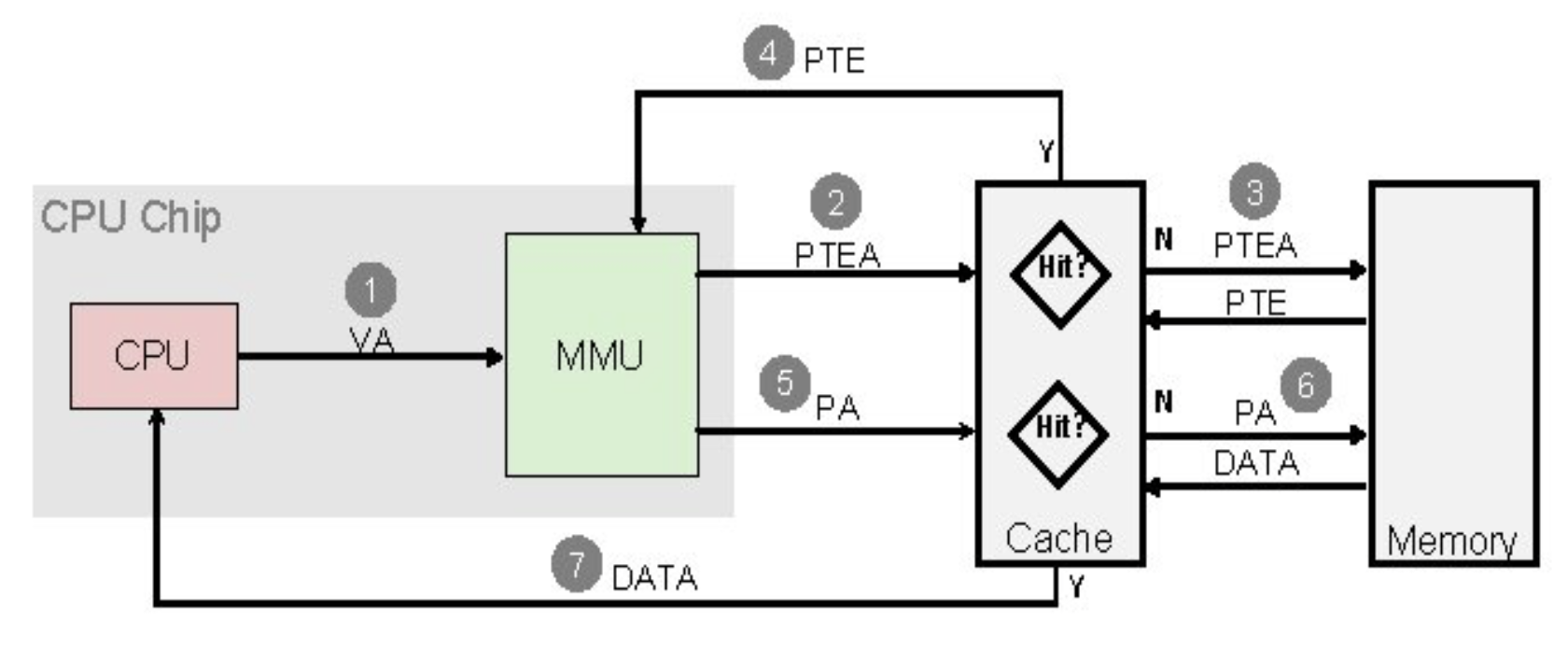 - 프로세서는 항상 (메모리에 있는) 페이지 테이블을 직접 읽는 것이 아니라, PTE를 필요로 할 때마다 TLB에서 페이지에 대한 변환 결과를 가져옴 (CPU에서 메모리보다 가까우므로 속도가 빠름)