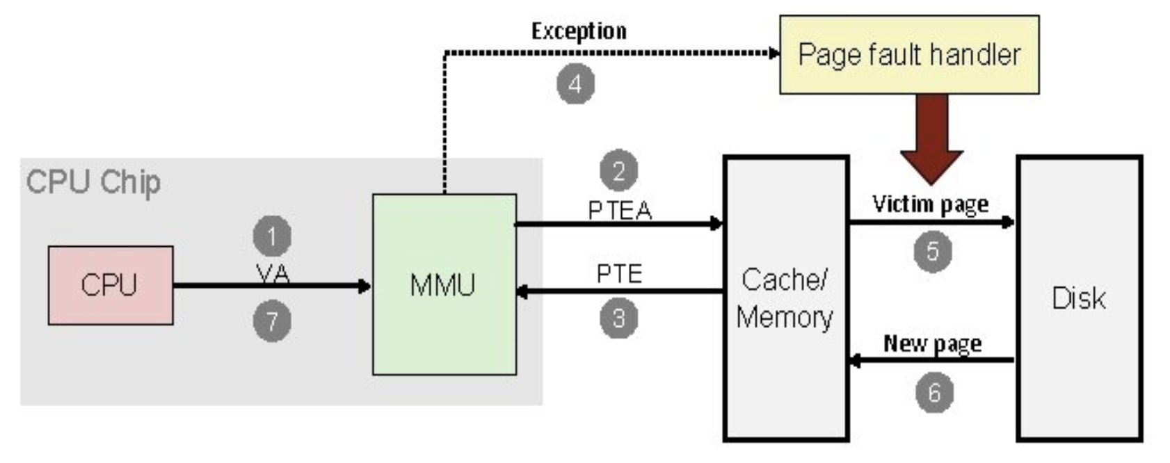 - 가상 주소가 프로세스의 가상 주소공간 내 유효하다면, 커널은 폴트가 발생한 가상 페이지를 디스크의 실행 이미지에서 찾아서 물리 메모리에 로드한 뒤, 페이지 테이블에 PTE를 추가