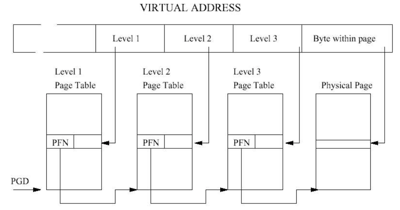 - 리눅스 커널은 3단계 페이지 테이블을 사용하며, 가상 주소는 각 단계의 페이지 테이블에서의 오프셋을 포함