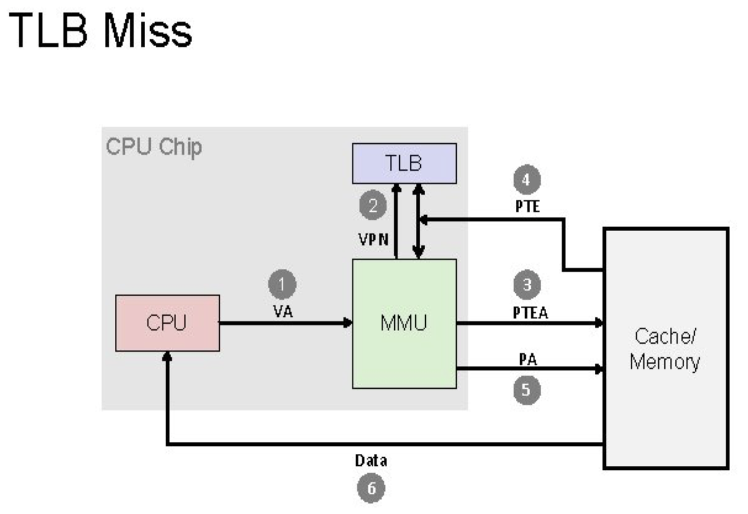 - CPU가 요청한 PTE에 대한 TLB 엔트리를 찾지 못하면, 커널에게 TLB를 찾지 못했다는 신호(TLB miss)를 보냄
