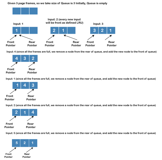 - 나이든 페이지는 스와핑의 좋은 후보이며, 연결 리스트로 구현됨 (사용된 페이지를 참조하는 노드는 리스트의 맨 뒤로 이동하며, 결국 리스트의 맨 앞에 있는 노드는 가장 적게 참조된 페이지를 가리키게 됨, 리스트가 꽉 차면 맨 앞의 노드를 제거)