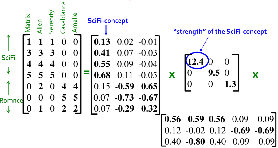 예시에 대해 구체적인 상황을 덧붙이자면, 어떤 원본 데이터에 대한 행렬 A가 각 사용자가 영화에 등급을 매긴 경우라 할 때(row는 사용자, column은 영화) 이를 분해해서 얻은 U는 사용자가 각 영화의 컨셉과 얼마나 관련이 있는지를 나타내고, V^T는 각 영화의 컨셉과 해당 영화가 얼마나 관련이 있는지를 나타낸다. 그리고 Σ의 대각원소는 현재 원본 행렬에서 영화의 컨셉이 얼마나 많은 비율을 차지하는지 (높은 강도로 점유하는지)를 나타내게 된다.