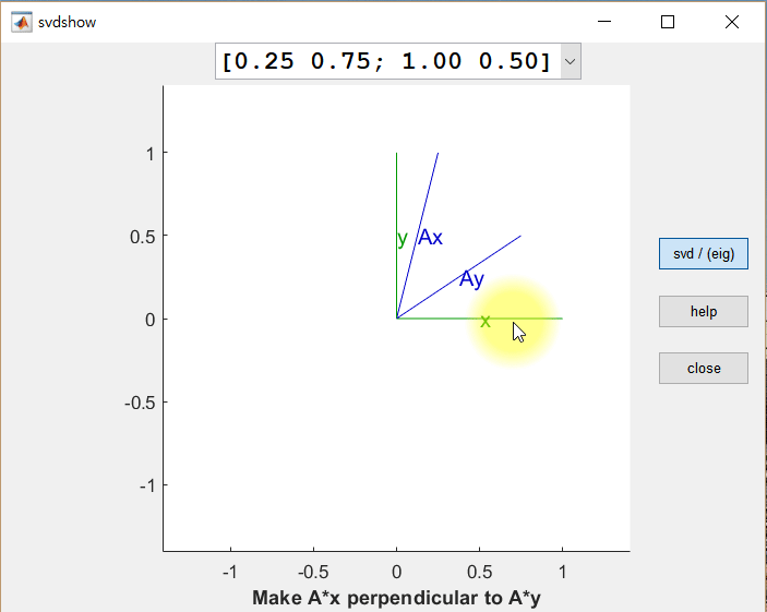 먼저 두 개의 직교하는 벡터 x, y를 행렬 A에 의해 선형 변환된 결과 Ax 와 Ay 를 살펴보면, 변환 후에도 Ax와 Ay가 직교 벡터가 되는 경우가 한 번이 아님을 알 수 있다.