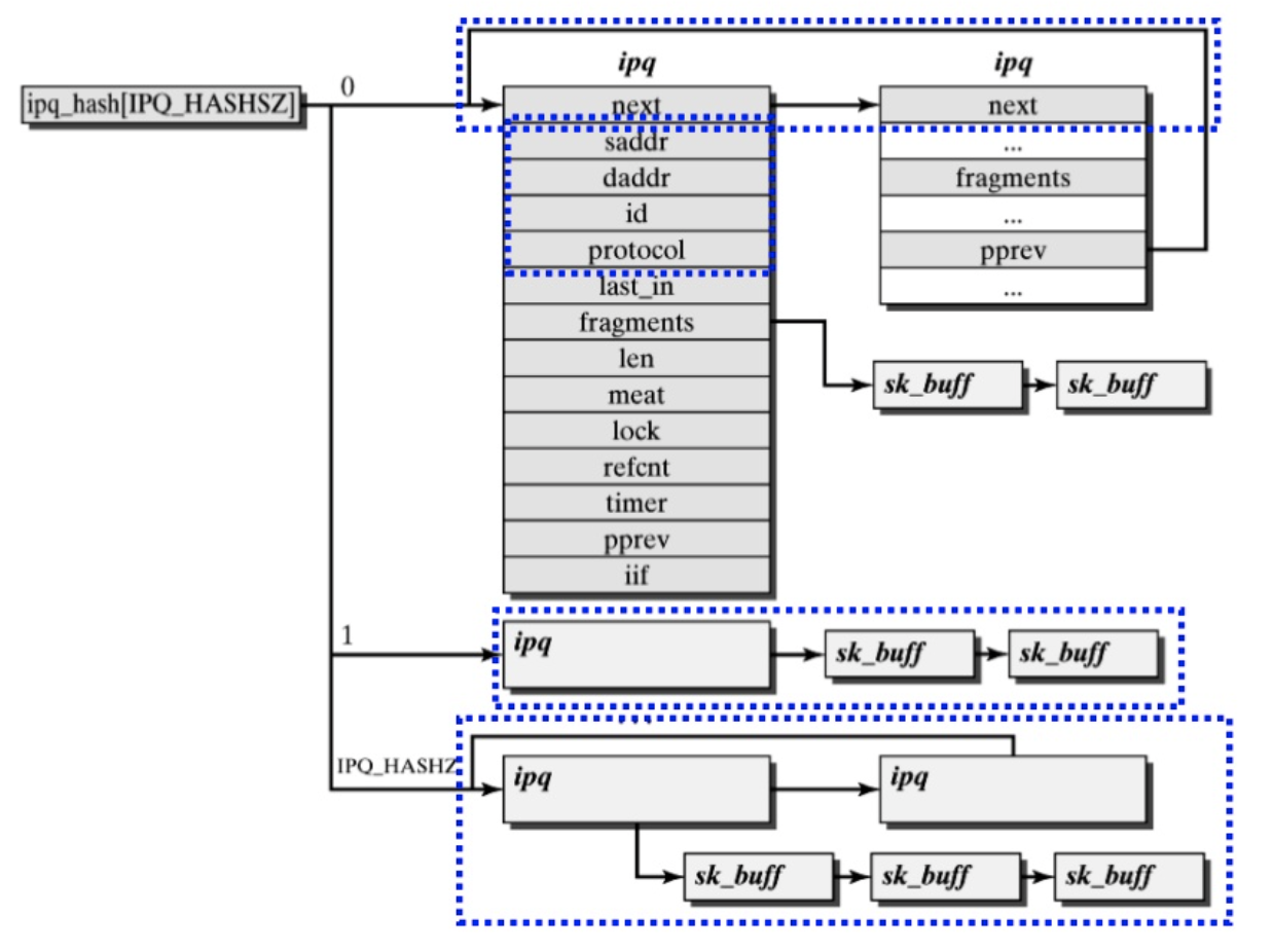 - IP 패킷 조각을 받을 때마다, 맞는 ipq 구조체를 찾기 위해 이 조각을 나타낼 ipfrag 구조체를 생성함 (ipq 구조체에서 fragments 변수에 저장됨)