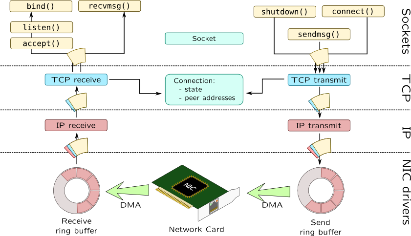 - BSD 소켓 계층은 각 함수를 호출할 때마다 INET 계층에 있는 BSD 소켓을 나타내는 socket 구조체를 전달하고, socket 구조체에 있는 data 포인터는 sock 구조체를 참조하는데, 이 구조체는 INET 소켓 계층에서 사용됨