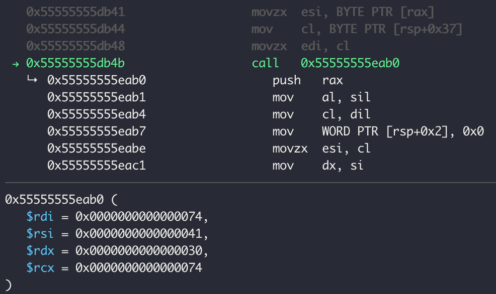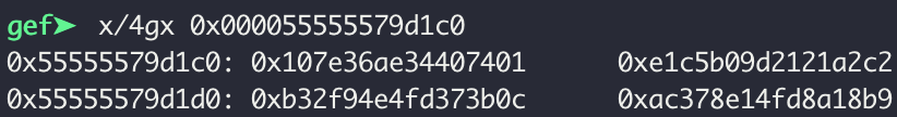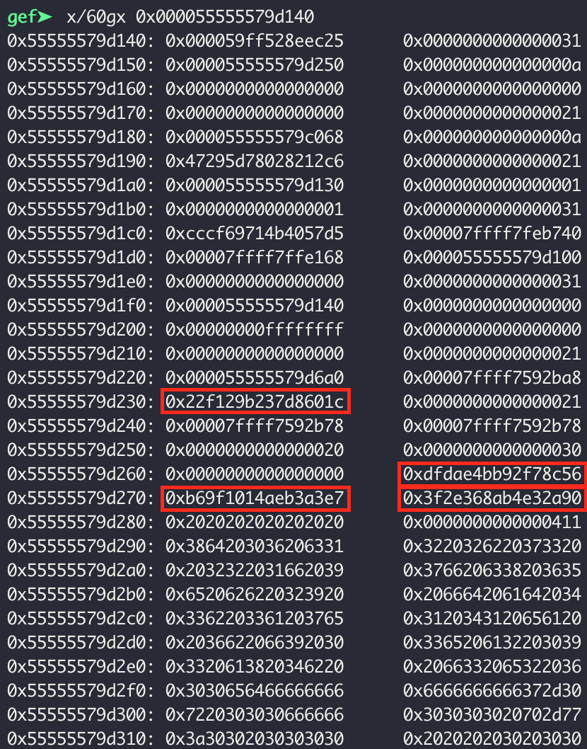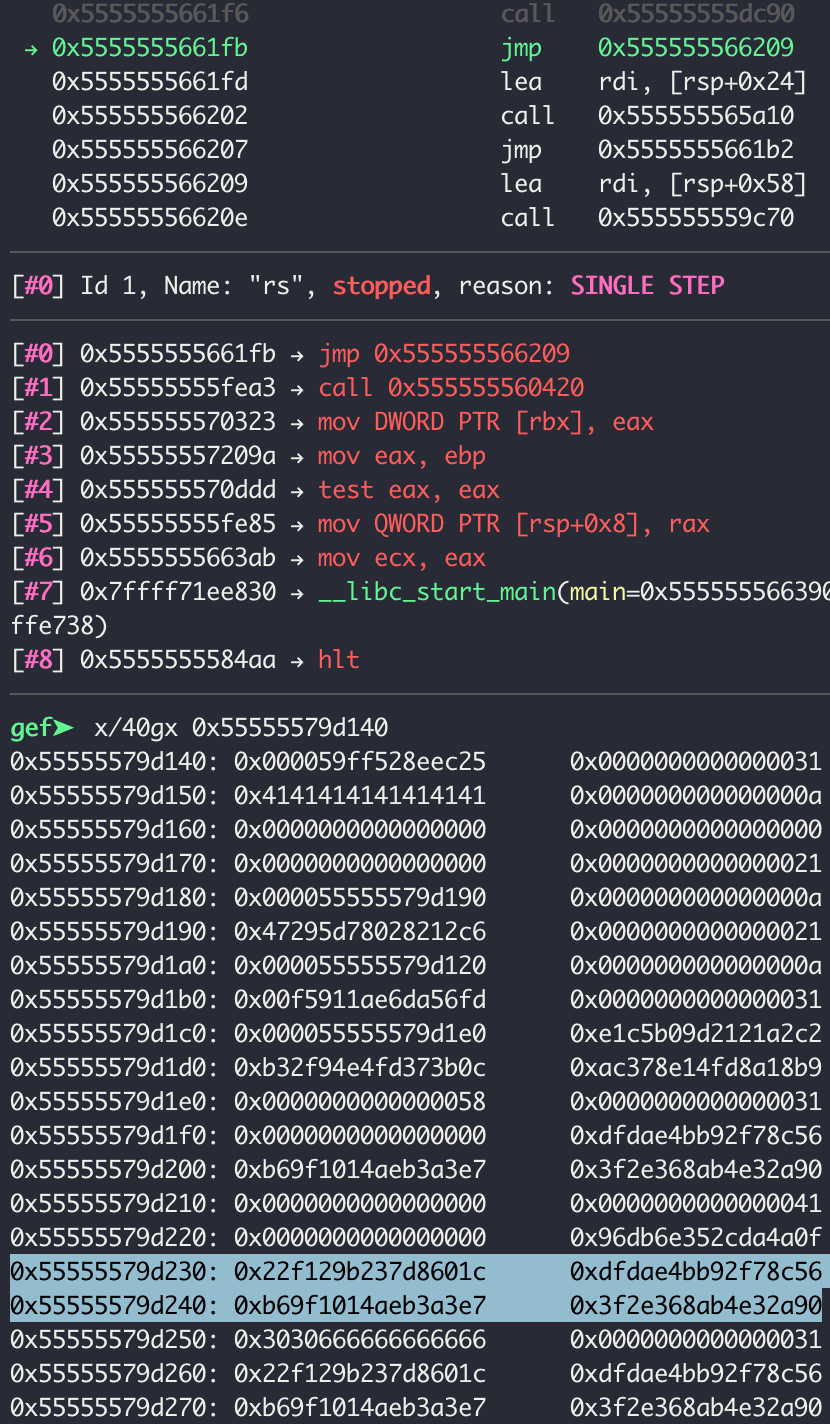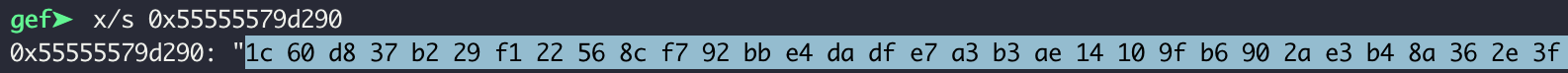 눈여겨 보고 있던 0x55555579d230 위치에 헥사값이 들어갔다. 즉, 0x55555555dc90 에서 알고리즘을 수행한다는 것을 알 수 있다.