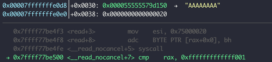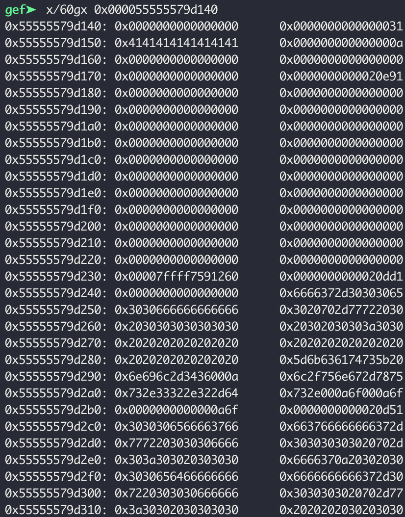 0x55555579d290 위치는 출력 내용이 저장된 것을 알 수 있고, 처음에 파일 내용 ("A"*8)을 저장한 곳에는 다른 값이 들어가 있다. 그리고 그 사이를 살펴보면 출력 내용에 해당하는 헥사값(빨간 박스)이 저장된 것이 보인다. 따로 떨어져 있는 건 아마 복사하는 과정이 있어서 그런 듯하다.