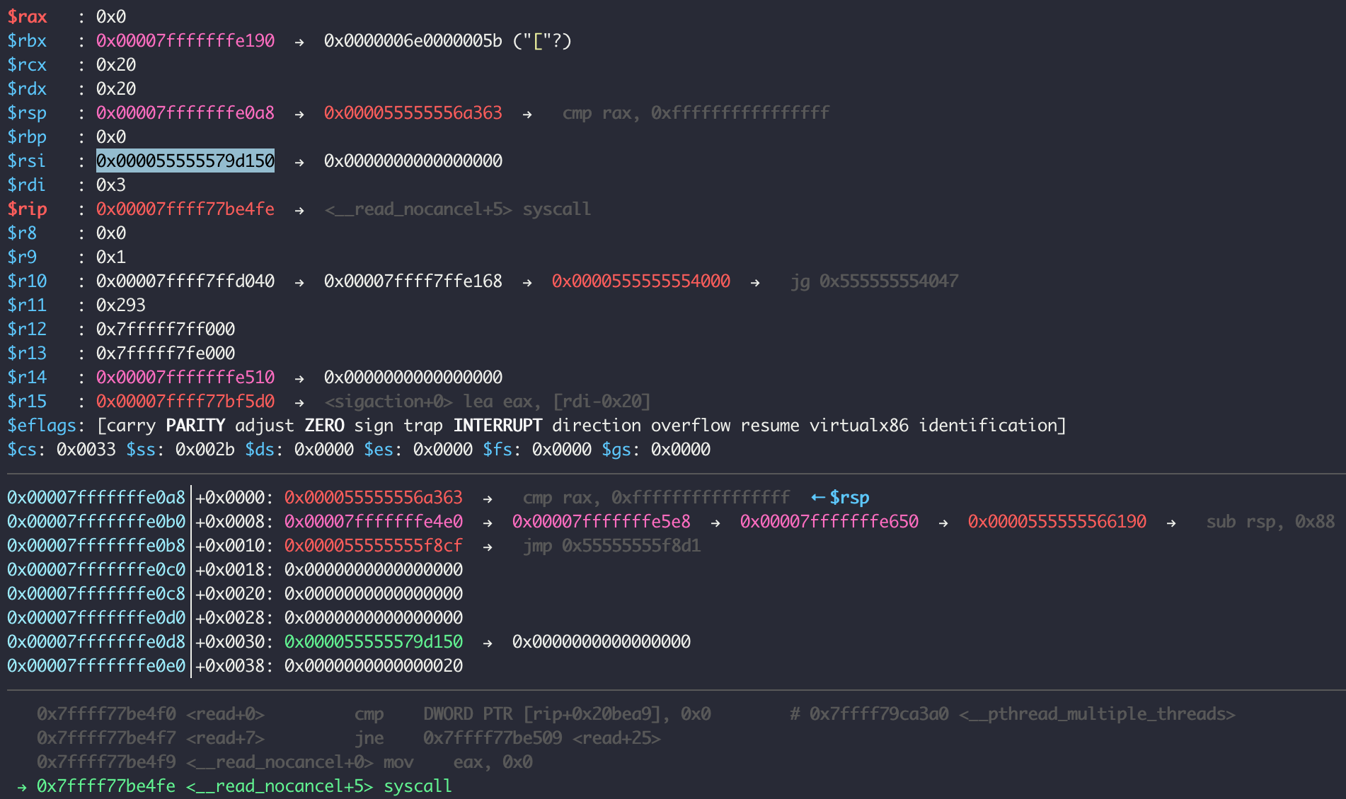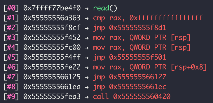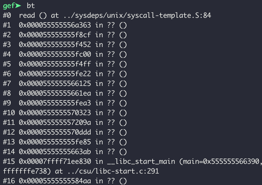 read() 를 호출했을 때의 trace 내용은 위와 같다. (최대 10개만 나열해서 보여주므로 자세히 보고 싶으면 bt 명령어를 써야한다.)
