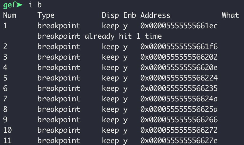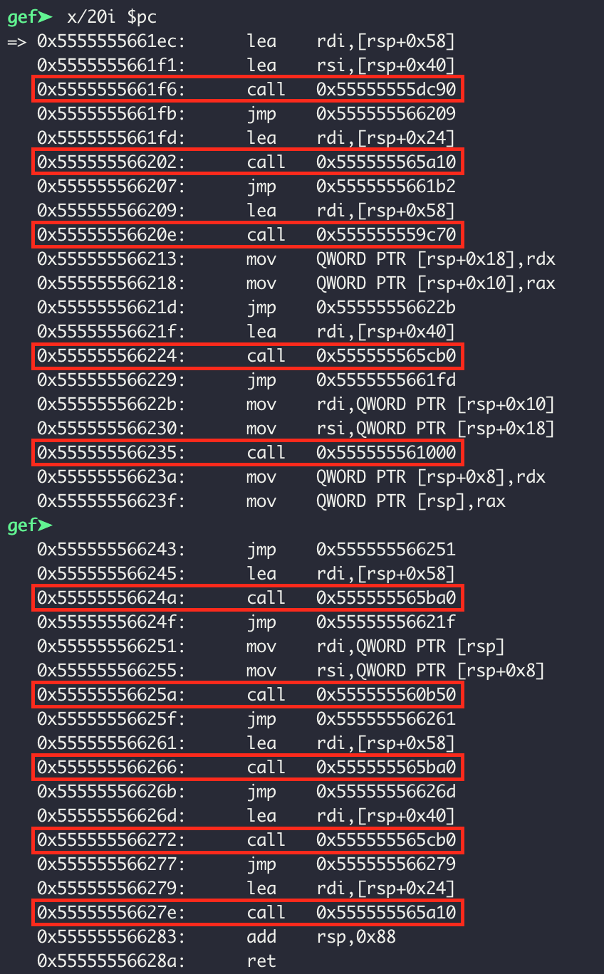 0x5555555661ec 에서의 코드를 살펴보면 call 명령어가 많은데 싹다 bp를 걸어서 이전에 했던 행동을 똑같이 반복한다.