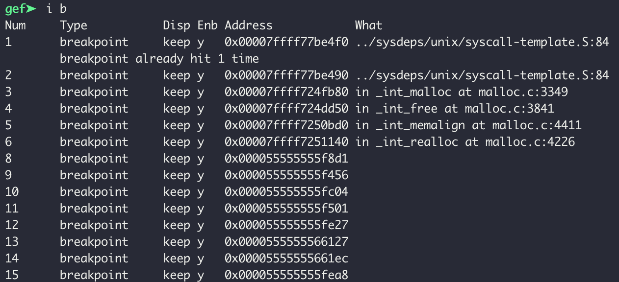계속 실행해보면 14 번째 bp가 걸린 0x5555555661ec 명령어를 실행하고 나면 힙이 바뀐다. 즉, 그 다음 bp 가 걸린 명령어 (0x5555555661ea8) 이전에 알고리즘이 수행된다는 것이다.